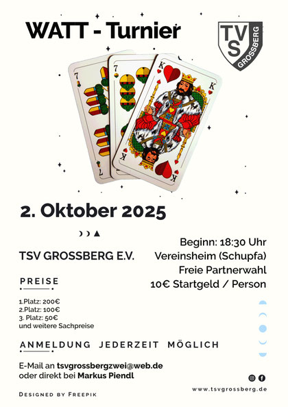 Am 2. Oktober 2025 fand das traditionelle Watt-Turnier des TSV Großberg statt – ein voller Erfolg mit 84 Teilnehmern, aufgeteilt in 42 Mannschaften, die in 3 spannenden Runden à 3 Spiele