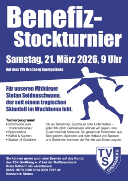 Am Samstag, 21. März 2026, um 9 Uhr veranstalten wir auf dem TSV Großberg Sportgelände ein Benefiz‑Stockturnier – und laden alle herzlich ein, die mit uns gemeinsam Gutes tun möchten.